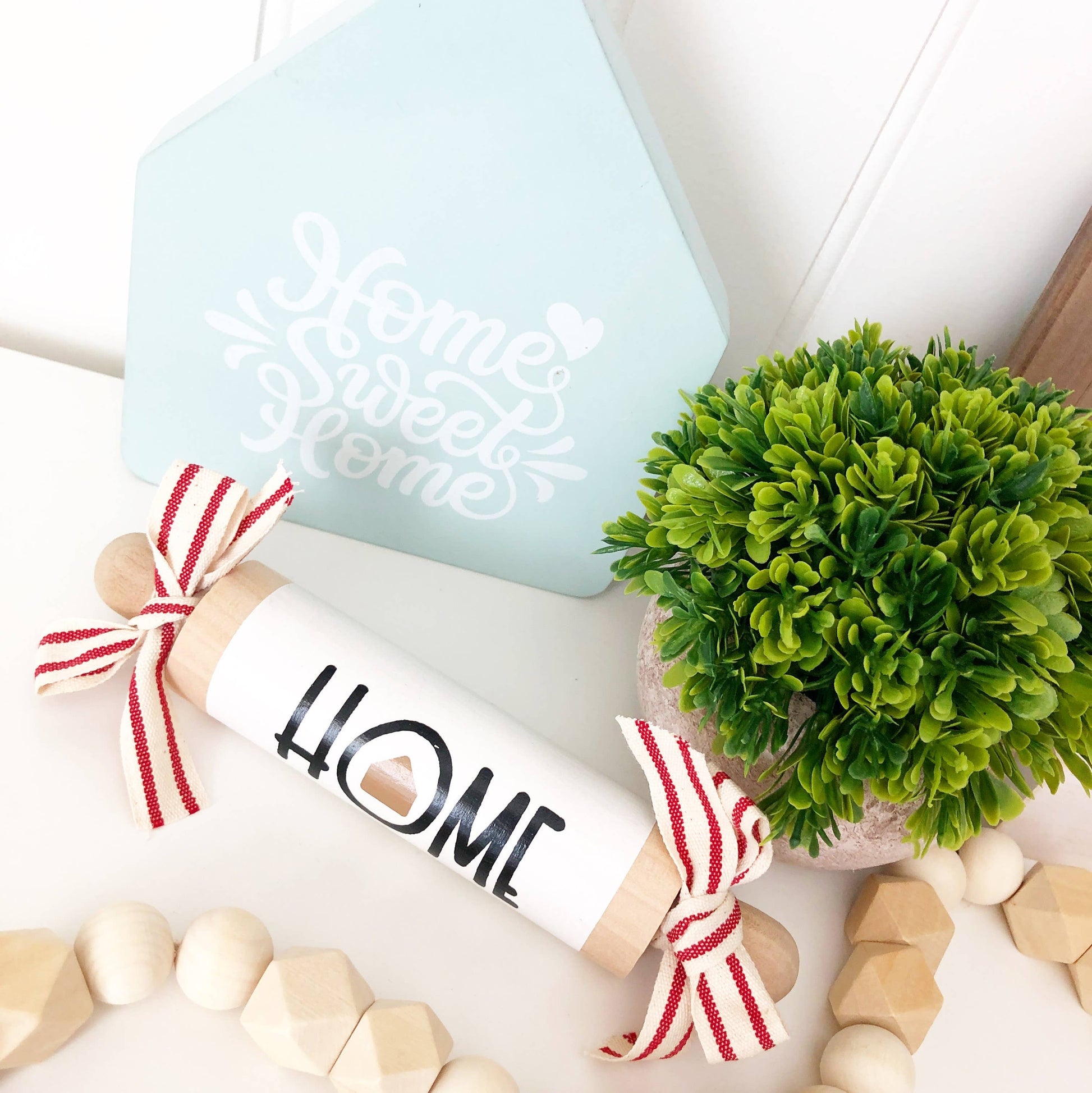 These small decorative rolling pins fit perfectly with a decorative cutting board, next to a mug, or in a tiered tray. Each comes with ribbon as shown and painted patterns and words as shown.